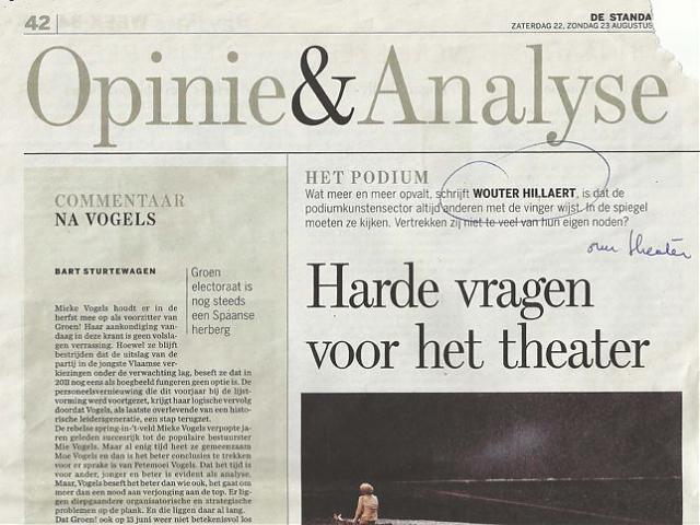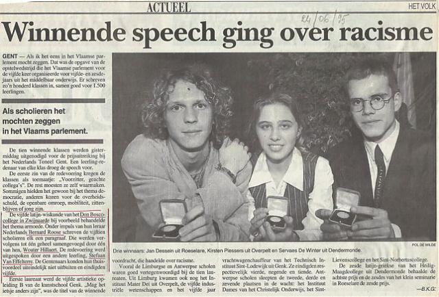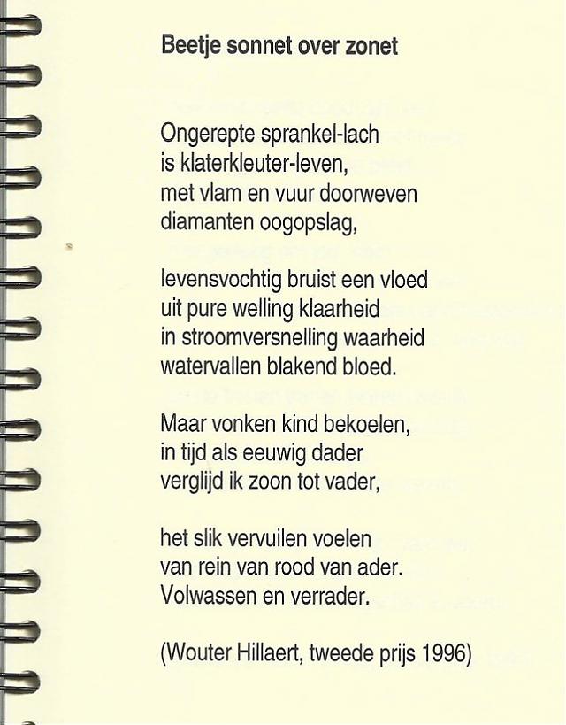 We verzamelden uit ons archief sporen van Wouter op DBZ en later. De klasfoto spreekt voor zich. Misschien heeft hij zelf – of Jeroen, Stefaan … – nog beelden uit Alden Biesen. Het krantenknipsel uit ’95 toont Wouter een voorafspiegeling van zijn huidige status. Het andere stukje getuigt van zijn kritische passie voor theater. Hij lanceerde ‘rekto verso’, een theatertijdschrift. In zijn gedicht, een van zijn vele prijzen, Sonnet over zonet, worstelt hij al met het “verraad” van volwassen worden en idealen verliezen. Het laatste beeld is bekend (dS Weekblad, 5 april 2015)